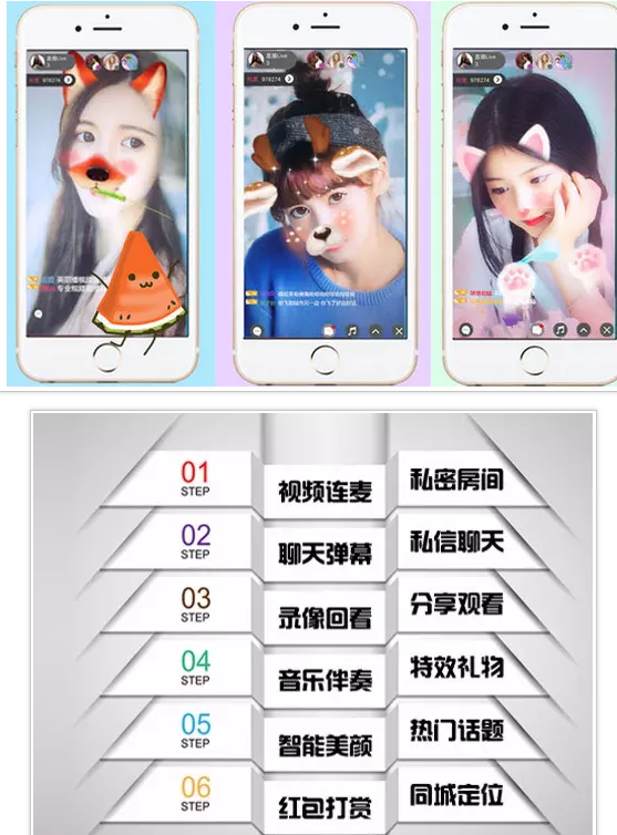 直播页面 用户头像、直播live、在线人数、映票、消息中心、在线用户列表、发言、消息中心、分享中心、礼物中心、礼物连送、关闭房间、举报、房间管理、伴奏、美颜、分享中心、萌颜、VR直播(开发中)