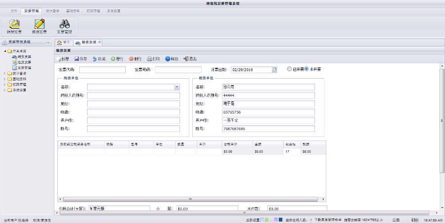1:开具发票 发票录入,发票的基本信息,购货方与销货方,可批量录入货物,使用动态增加行,支持快捷键,自动计算常用金额等.方便快捷录入. 发票管理.对发票可进行多条件查收询,并作修改或删除.