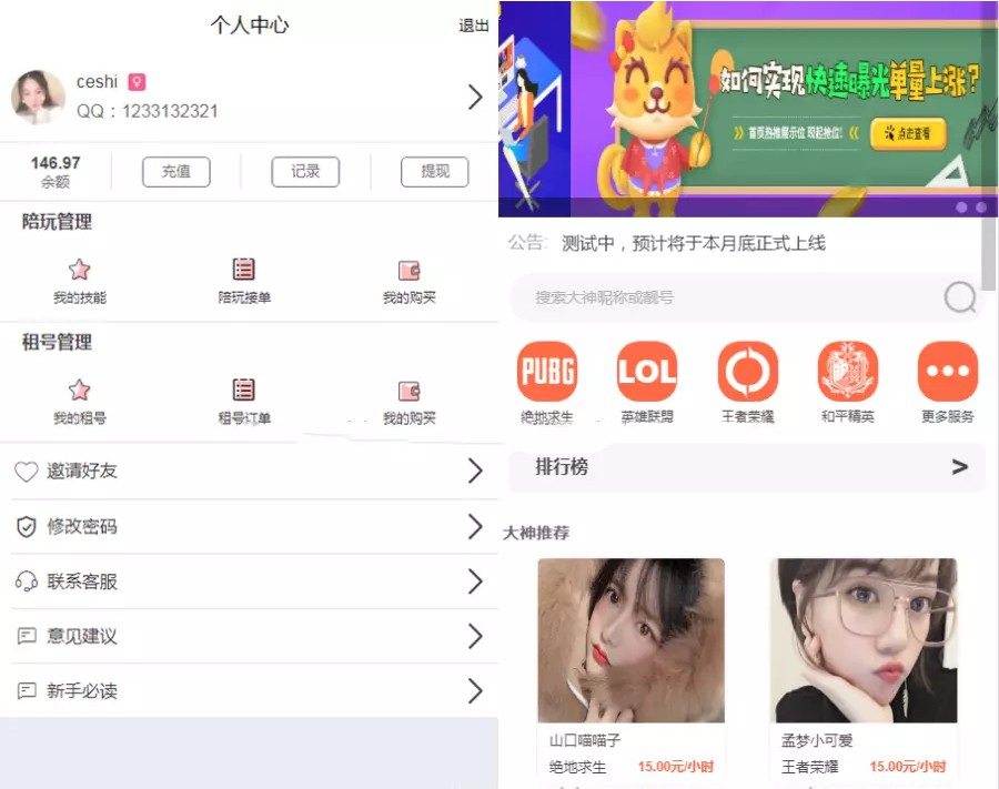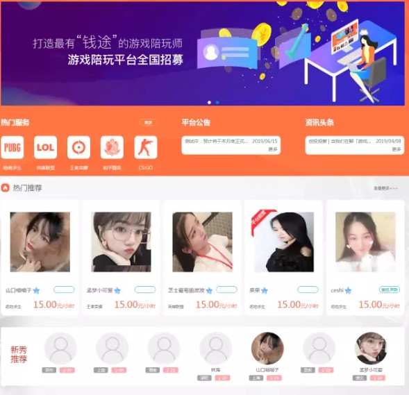 游戏陪玩平台源码约玩网站源码 自适应 可封装APP